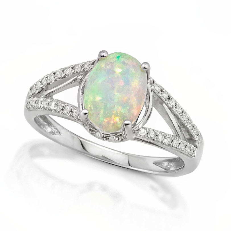 Center Stone: Natural White Opal (oval cut, approx. 8x6mm)