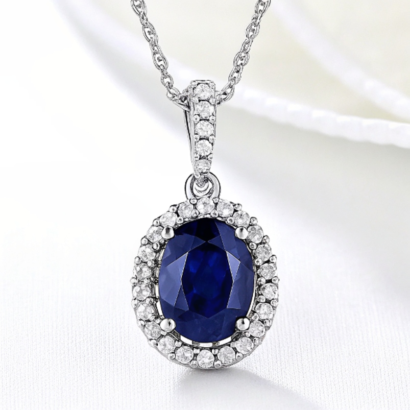 At the heart of this exquisite piece rests a deep royal blue oval-cut sapphire, symbolizing wisdom, serenity, and everlasting love. Surrounding the centerpiece is a delicate halo of round brilliant-cut diamonds, each hand-set to amplify the sapphire’s captivating glow. The diamond-encrusted bail seamlessly connects to a refined 18K white gold chain, adding a touch of brilliance from every angle.